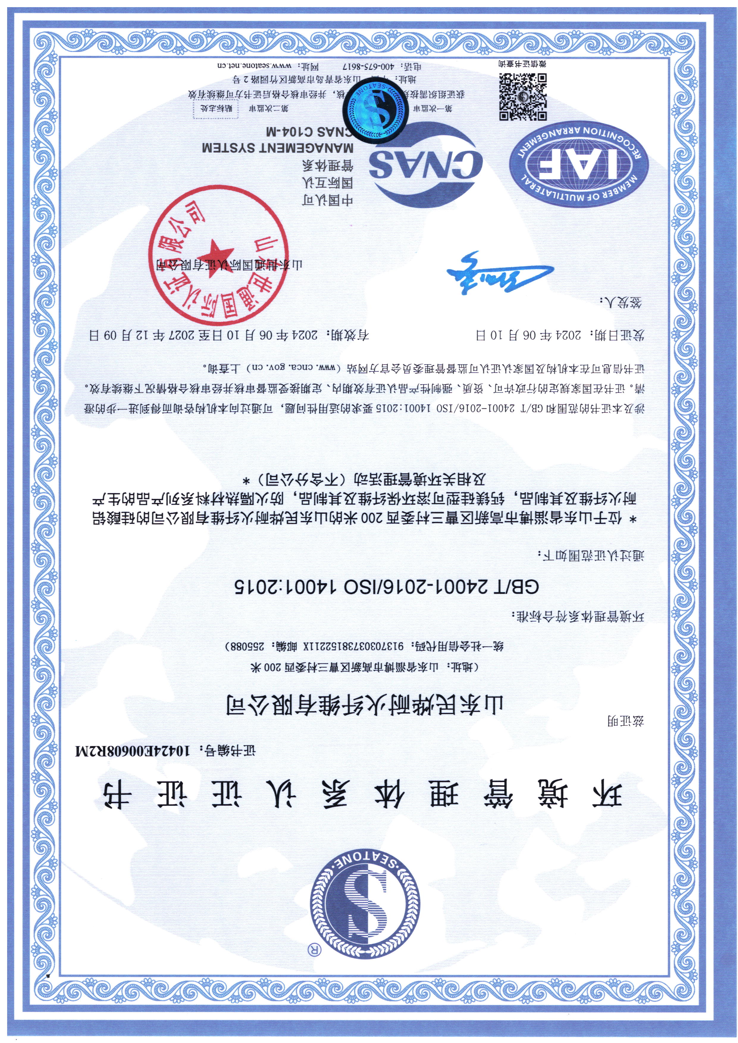 • 2024年環(huán)境體系認(rèn)證證書